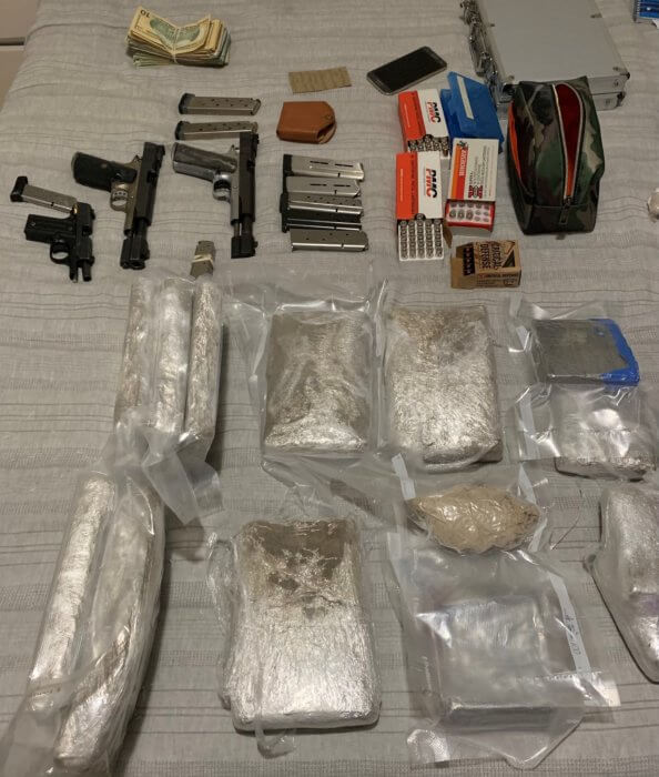 According to law enforcement, the duo returned to the area shortly after 6 p.m. where members of the Tactical Diversion Squad placed the two men under arrest. Also located in the closet was a metal case containing three pistols, one of them loaded.