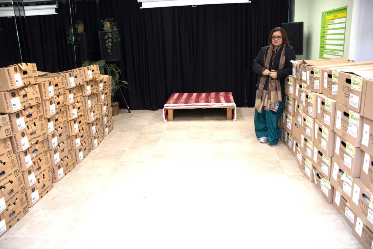 Bangladesh Academy of Fine Arts Executive Director Farida Yeasmin with boxes of the turkeys being given away. Photo by Jewel Webber(Left to right) Bangladesh Academy of Fine Arts Artistic Director Spondon Aftabuzzaman, Farjana Yeasmin and Farida Yeasmin. Photo by Jewel Webber