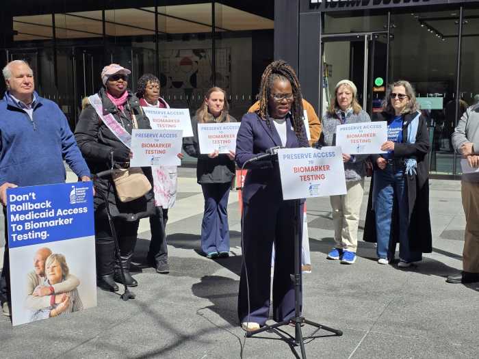 A group of cancer survivors from the Bronx and statewide gathered outside Gov. Kathy Hochul’s NYC office on Third Avenue on April 7 to implore her to preserve Medicaid funding for precision treatment known as biomarker testing.