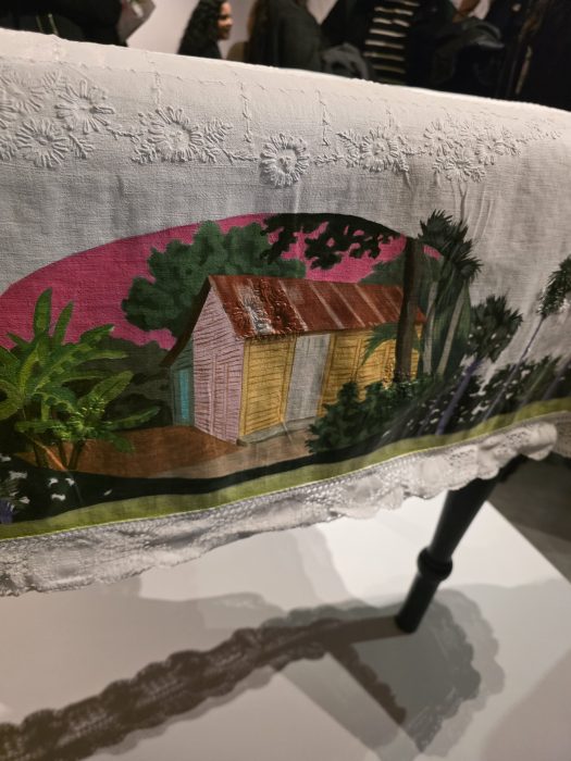 Delvin Lugo of the 2024 AIM fellowship cohort showed a piece in the center of the room that was impossible to miss. “Country to City/Town to City” is a wooden table covered by a lace-edged vintage tablecloth, which Lugo painted with self-portraits and four of the places he has called home.