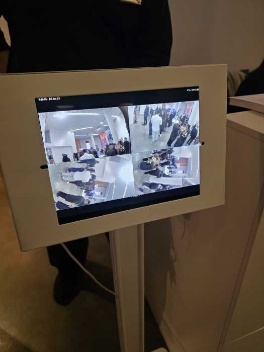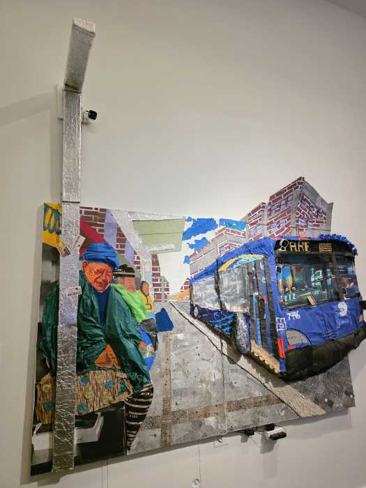 The work hangs near the museum entrance and depicts an MTA bus traveling along a city street, with people standing on the side. Plugged into the work are four small cameras, which — probably unbeknownst to most — were live streaming to a small screen at the front desk.