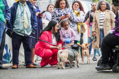 NYC Council Majority Leader Amanda Farias introduced a couple of furry friends to a young girl Friday at the unveiling of the new dog park at Castle Hills Houses.