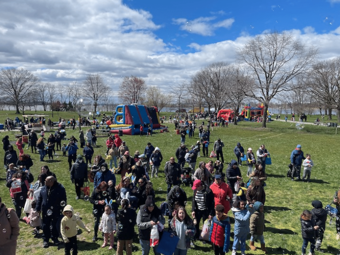 Attendees enjoyed a variety of activities like the 15,000 Easter egg hunt, performances, photobooth, carnival games, DJ, bounce houses, magic show, balloon animals, caricature artist, face painting, food and free giveaways. Two added benefits included free Easter baskets and candy that were given to each child upon entry, plus an egg and spoon race with special guest participants Congressmember Alexandria Ocasio-Cortez and Bronx Borough President Vanessa Gibson.
