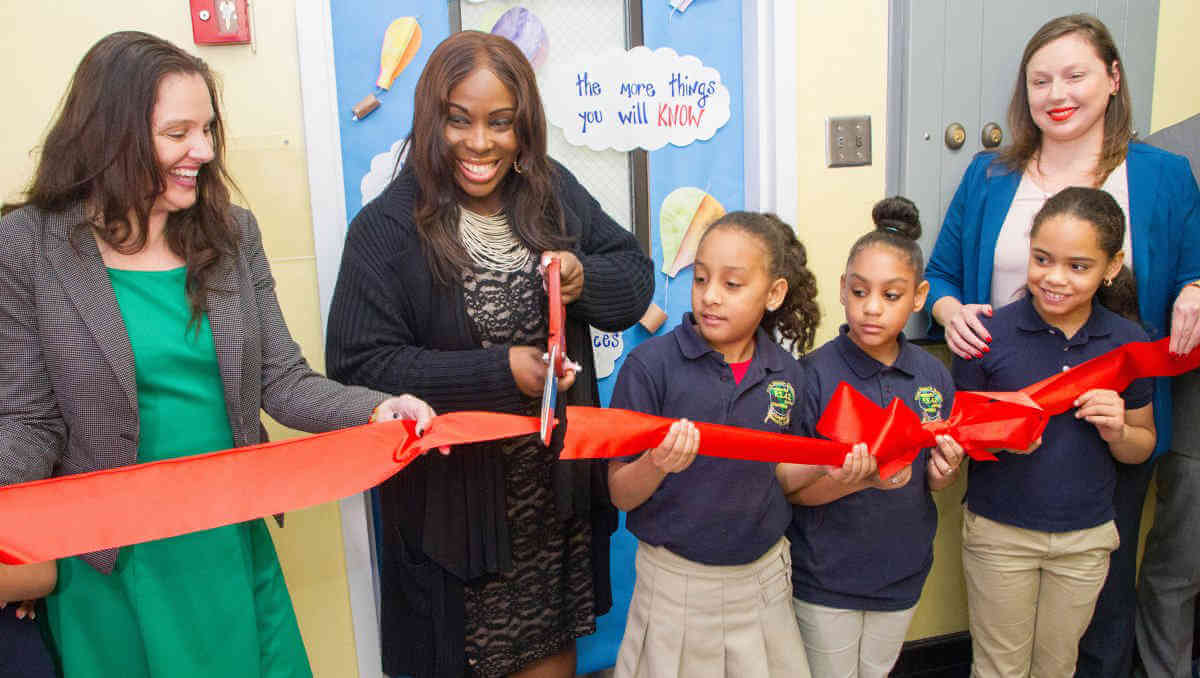 The celebration featured a special performance from the student chorus, a Student Council President address, a formal ribbon-cutting and an interactive read aloud led by Gibson to inaugurate the new library.