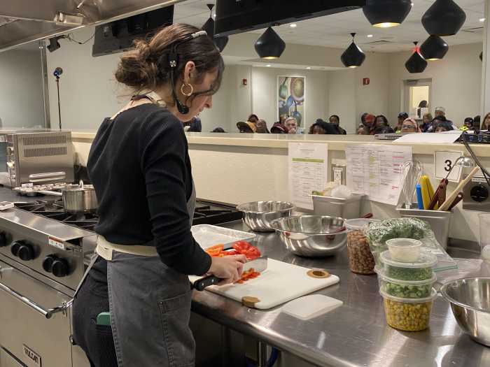 Andrea Polvere, the culinary educator at SBH Teaching Kitchen, instructed a live cooking demo teaching residents about healthy, culturally relevant recipes to help them reimagine ways of eating that manage their diabetes and reverse a pre-diabetes diagnosis.