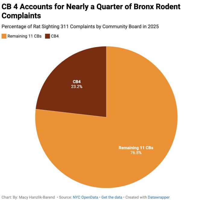 City data from the NYC Rat Sightings database, which records all 311 service requests related to rat sightings, shows that Community Board 4 accounts for nearly a quarter of all rodent complaints in the Bronx’s 12 Community Boards in 2025, underscoring the scale of the infestation in the area. The database is published through NYC Open Data, which provides free public data from city agencies.
