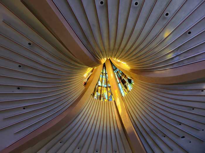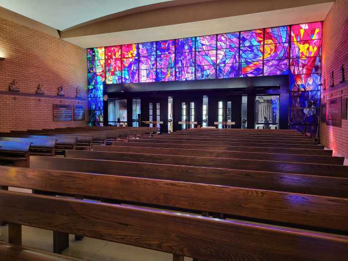 Oieni McCabe got married there in 1961, but it burned down the following year in a suspected arson incident. The current building opened in 1968 and features numerous stained glass windows, a dramatic skylight, large wooden pews and antique statues of divine figures.