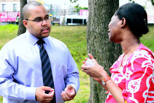 Michael Blake celebrated after results showed him besting Marsha Michael, who had been backed by much of the Bronx Democratic political establishment, in the 79th district, which includes much of Morrisania and Tremont.