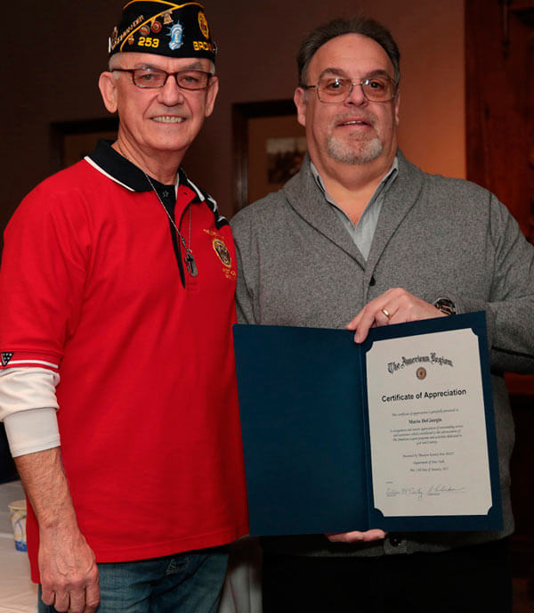 The Theodore Korony American Legion Post 253 honored Mario DeGiorgio, Youngland/Kid City Stores district manager, on Sunday, February 19 at the American Turners Club for assisting the post’s annual toy drive.