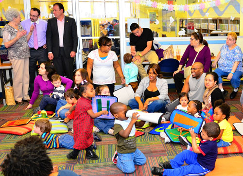 Decked with a letter of the alphabet, the colorful cushions were certainly welcomed by parents who stopped by the unveiling the morning of April 9, or “toddler time” as head librarian David Nochimson put it.