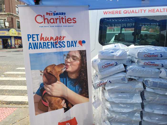 On the third annual Pet Hunger Awareness Day, Food Bank for NYC and PetSmart Charities teamed up to provide Bronx residents and their pets with a variety of items, including fresh produce, shelf-stable foods, cleaning supplies, 11-pound bags of cat food, 15-pound bags of dog food, collapsible water bowls, toys and bright orange bandanas for large and small dogs.