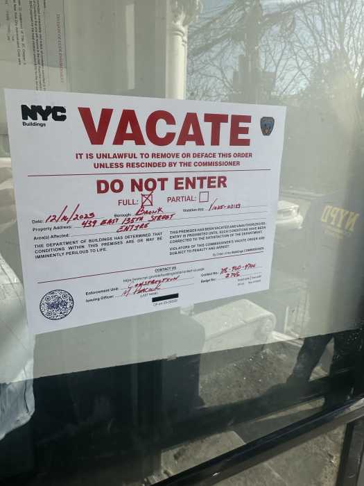 After inspection, the New York City Department of Buildings issued a full vacate order on Dec. 16 determining the structure was not safe for residents to return.