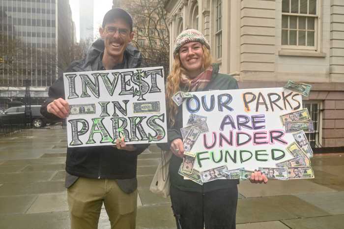 Over 100 New Yorkers gathered on the steps of City Hall in Manhattan, chanting “What do we want? One percent! When do we want it? Now!” as the rain poured in. They all had one goal in mind: to obtain a fully funded parks system.