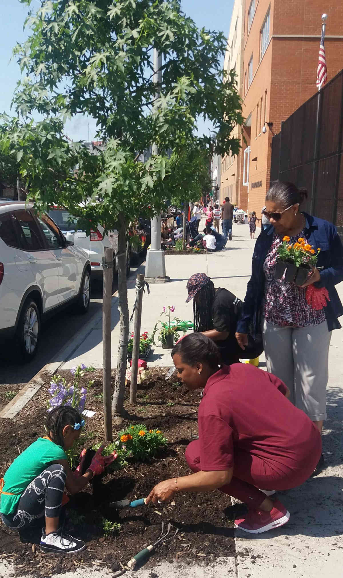 P.S. 77 principal Carolyn Heredia (r) and participants were hard at work planting flowers.