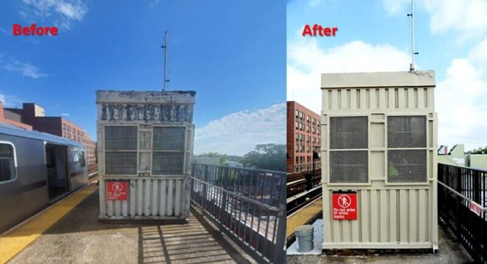 The effort is part of New York City Transit’s Re-NEW-vation Program, which allows workers to perform upgrades, repairs and enhanced cleanings in subway stations during a 55-hour window while there are weekend service outages.