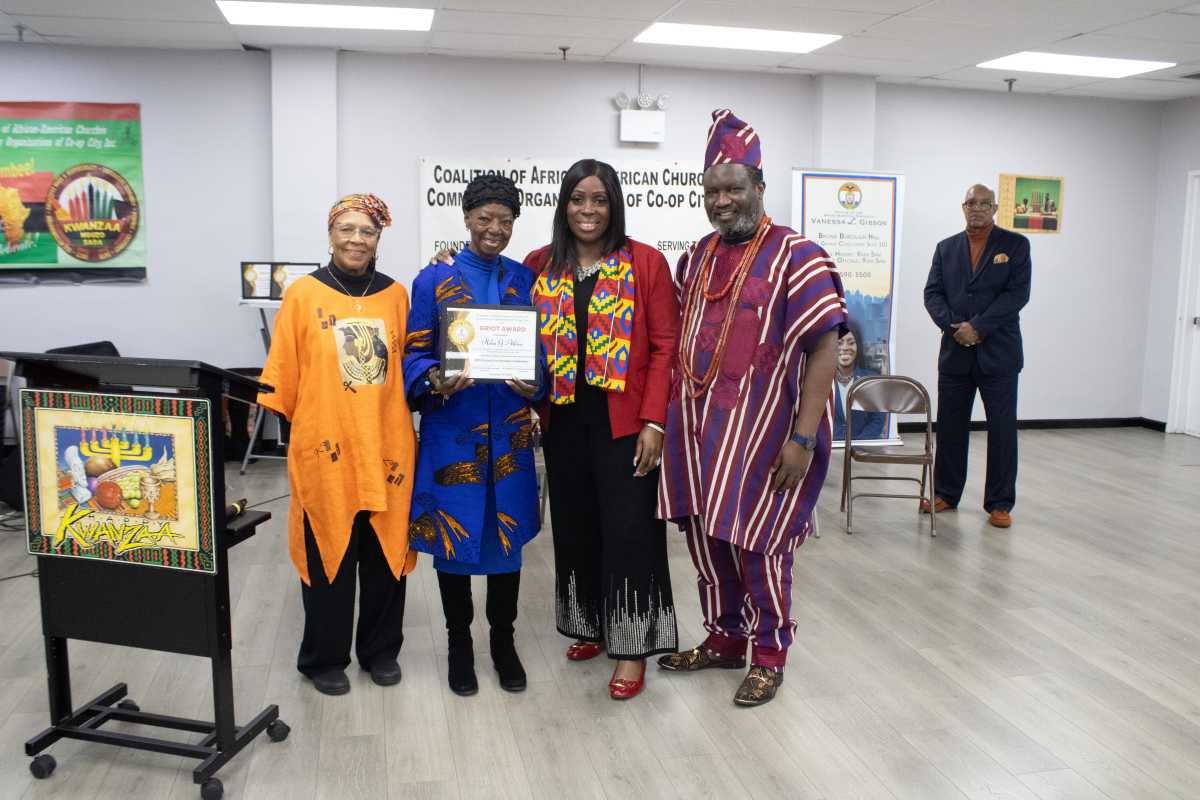 The Coalition of African American Churches and Community Organizations of Co-op City, Inc., partnered with Bronx Borough President Vanessa L. Gibson (second from left) to host a Pre-Kwanzaa celebration.