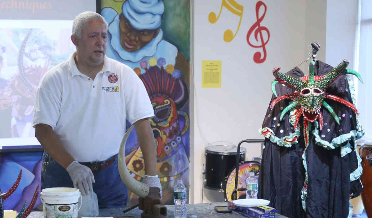 Felipe Rangel, a Puerto Rican folk artist and teacher of Ponce’s carnival, hosted a PRIDA Ponce Vejigante Mask Workshop on Saturday, July 13 at Bronx Music Heritage Center. As one of the only vejigante maskmakers in NYC, Rangel led a presentation on the history of the masks which are one of Puerto Rico’s most colorful arts and crafts.
