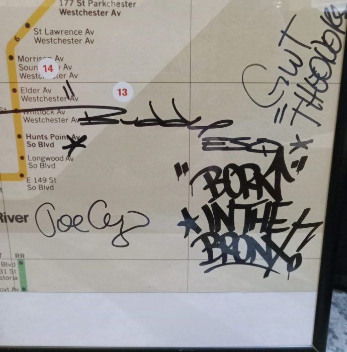 The map is signed by Grand Wizzard Theodore, credited with inventing record scratching at age 12; Buddy Esquire, who created hundreds of flyers for early hip-hop events; and photographer Joe Conzo, whom the New York Times called “the man who took hip-hop’s baby pictures.”