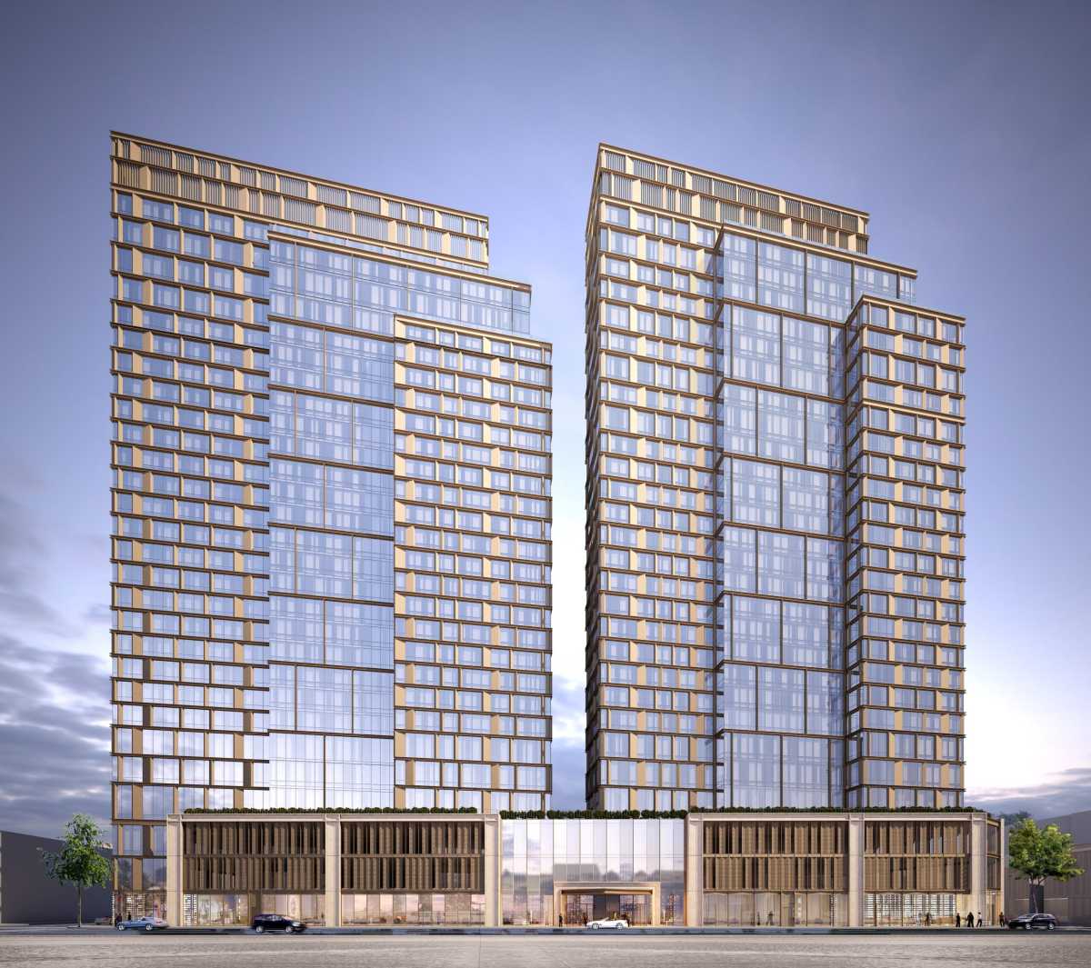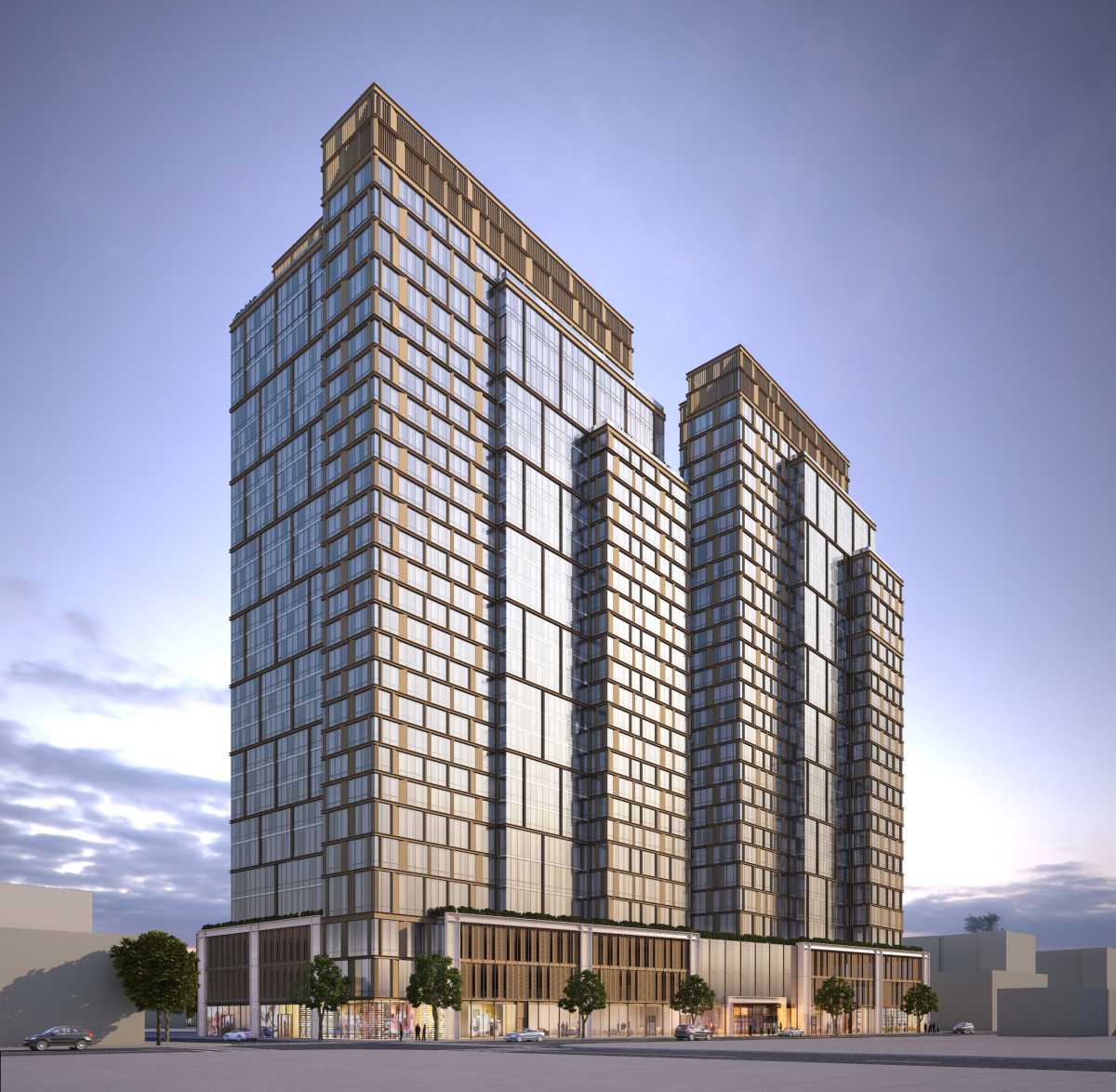 Renderings of the property, which would cover a full block, show the buildings being connected by a multi-story podium, which would house the retail space and parking garage. The facade is shown to have floor-to-ceiling glass framed by beveled bronze-hued paneling, while the central volume on the towers has expansive stretches of glass, with a staggered grid of mullions arranged in 3-story increments. Both towers rise in cohesive multifaceted forms that step upward to tall bulkheads.