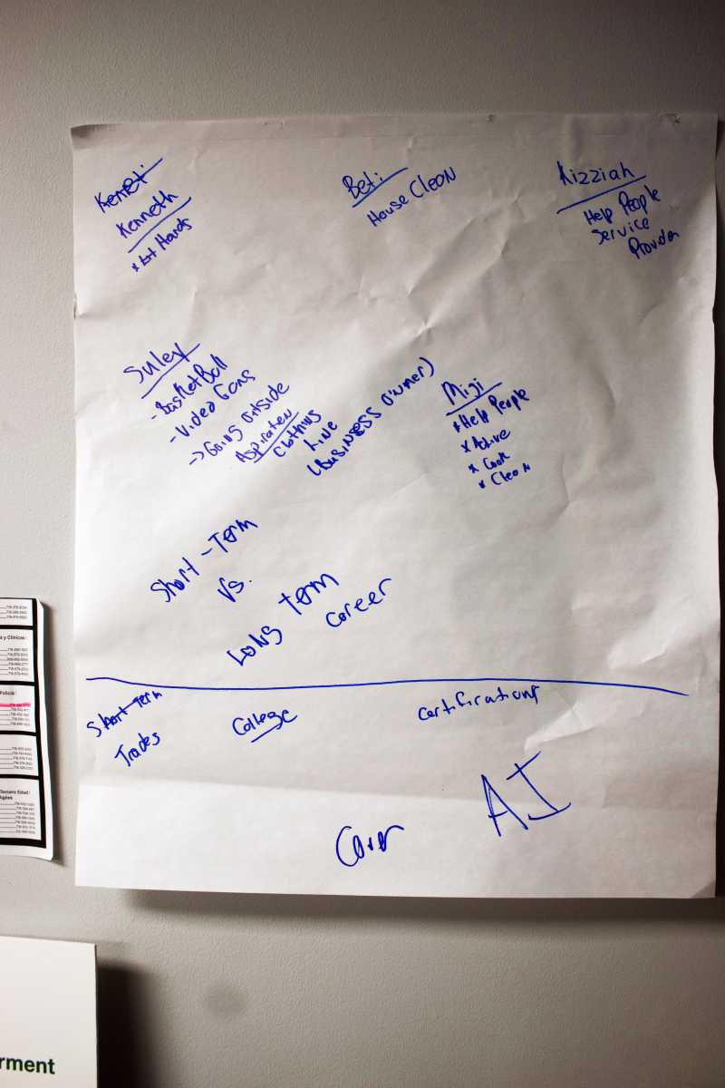 Participants also had the opportunity to share their own experiences and input related to the subject matter. Additionally, they were encouraged to share their own aspirations, both short-term and long-term, by writing them down on a sheet on a wall.