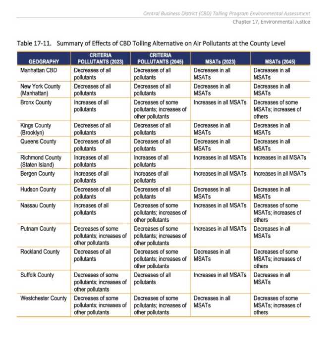 The MTA also found that with the implementation of the CBD Tolling Alternative, traffic patterns would shift  because of drivers who divert to avoid the new toll. It also predicted an increase of all air pollutants for the Bronx.