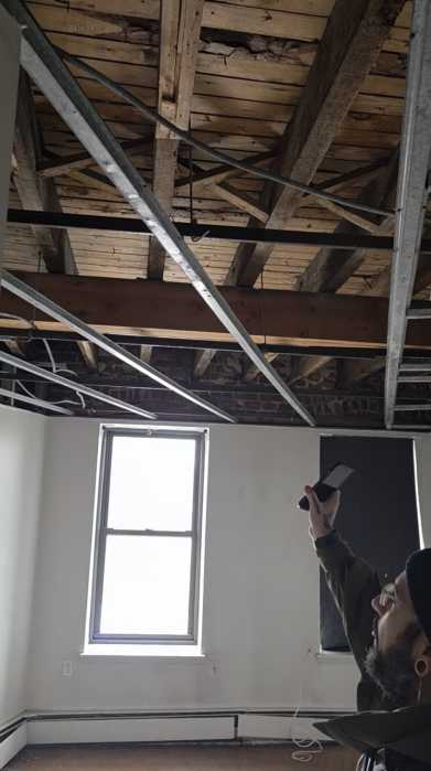 Most of Cruz’s apartment, including the bedroom, currently has no ceiling and wiring and beams are exposed. Her belongings are stacked in the living room, which appears intact.