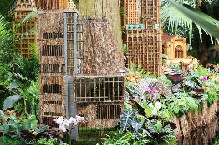 Designed by the creative team at Applied Imagination, the exhibit merges natural plant life with organic materials and electric engineering. Surrounded by tropical trees and flowers, dozens of buildings create a makeshift city inside the Enid A. Haupt Conservatory where model trains run on tracks above, below and in opposite directions.