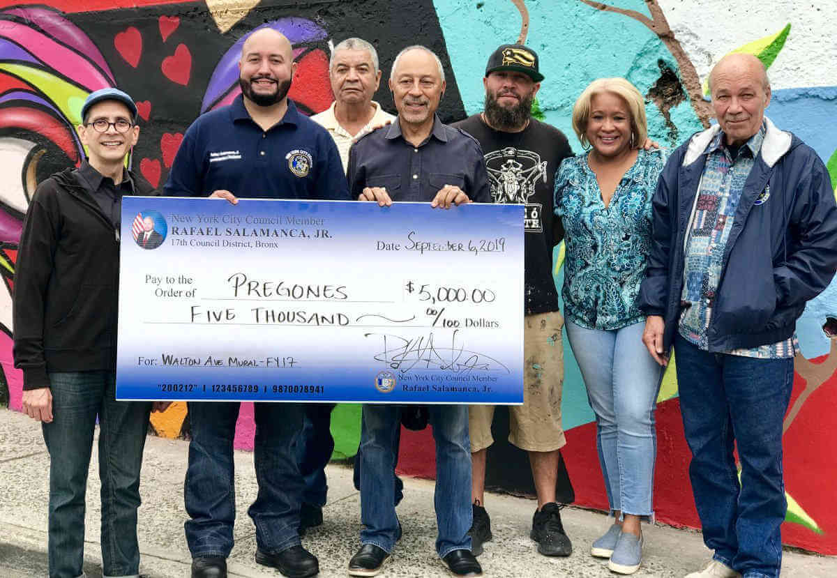 Councilman Rafael Salamanca joined Pregones/Puerto Rican Traveling Theater and Julio Pabon, South Bronx Community Association president to unveil ‘The World Needs Love’ mural. The mural painted by Puerto Rican artist, Ralph Serrano now decorates the once bland wall on East 150th Street between the Grand Concourse and Walton Avenue.