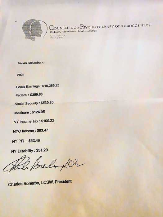 The Bronx Times spoke with seven former employees, both on and off the record at Counseling & Psychotherapy (C&P) of Throggs Neck. They all said that the owner, Charles Bonerbo failed to provide 2024 W-2s and paystubs and several were missing at least one paycheck.