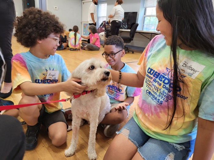 Kids at WHEDco’s Summer Arts Day Camp in the Bronx have made some new friends, but Lucy, Penny and Buster aren’t fellow kids — they’re trained therapy dogs who visit twice a week for lessons in dog handling and social-emotional growth.
