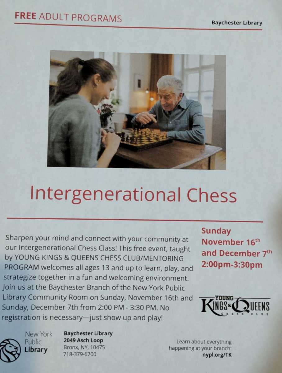 The Young Kings and Queens Chess Club wrapped up their intergenerational chess program with its final session at the Baychester Library, located at 2049 Asch Loop in Co-op City, on Sunday, Dec. 7.